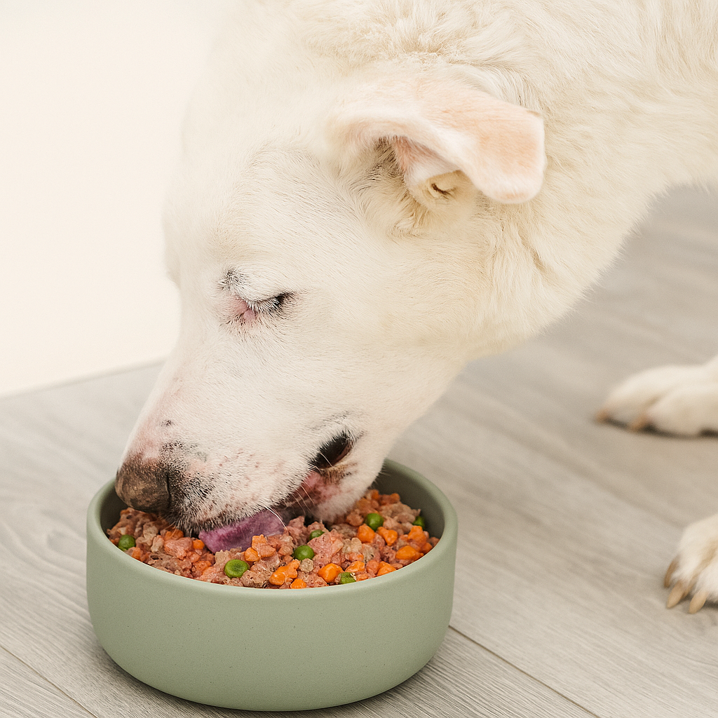 · Dacă câinele tău n-a avut niciodată hrană proaspătă, începe mai lent, amestecă 50%-50% pentru câteva zile cu bobițele uscate obișnuite înainte de a trece complet la hrană proaspătă, ca să-i dai timp stomacului să se obișnuiască.